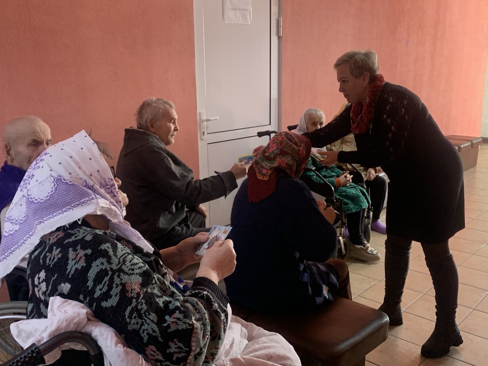 В завершении Республиканской благотворительной акции «От всей души» волонтёр «серебряного» возраста Александр Гребенок и специалисты территориального центра поздравили с праздниками пожилых граждан, проживающих в больнице сестринского ухода в н.п. Бывальки, вручив им сладкие угощения и открытки, изготовленные людьми с инвалидностью. Атмосфера встречи была наполнена добротой и искренностью благодаря душевным песням в исполнении Александра Гребенка.